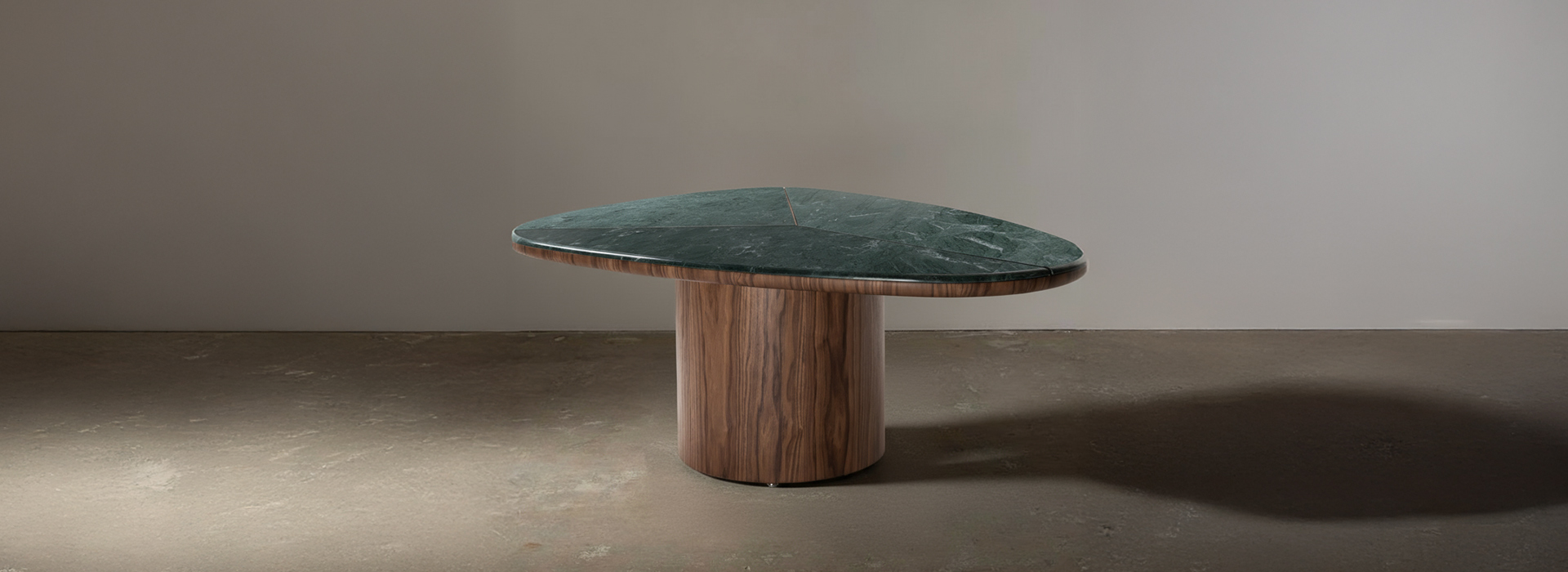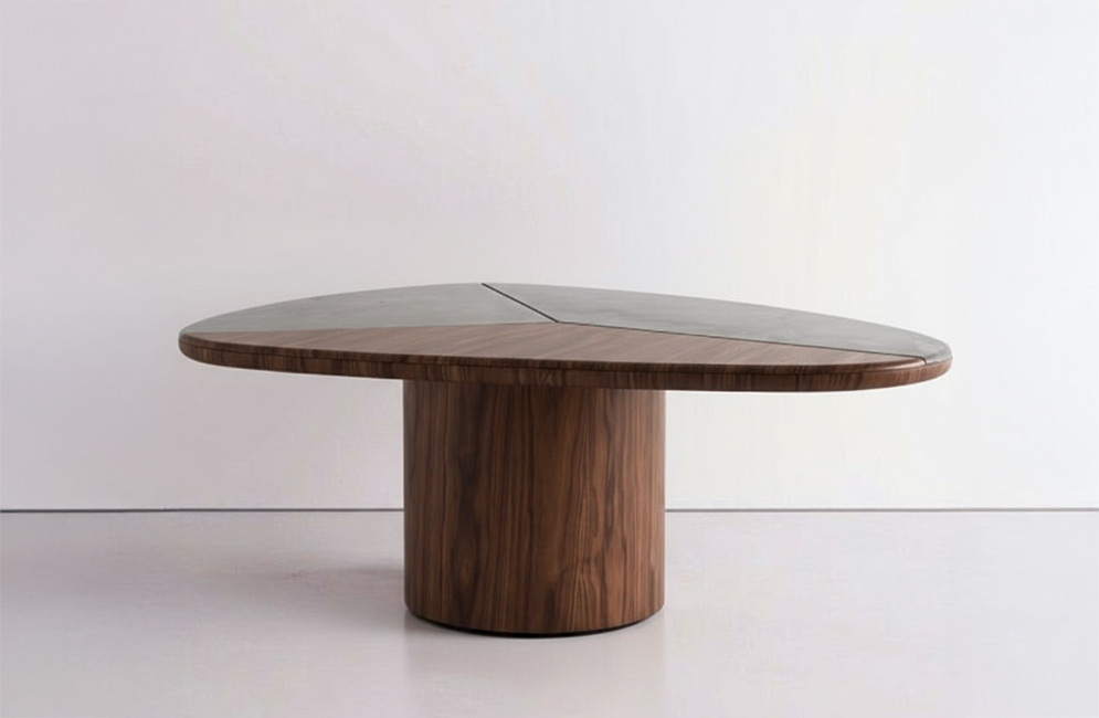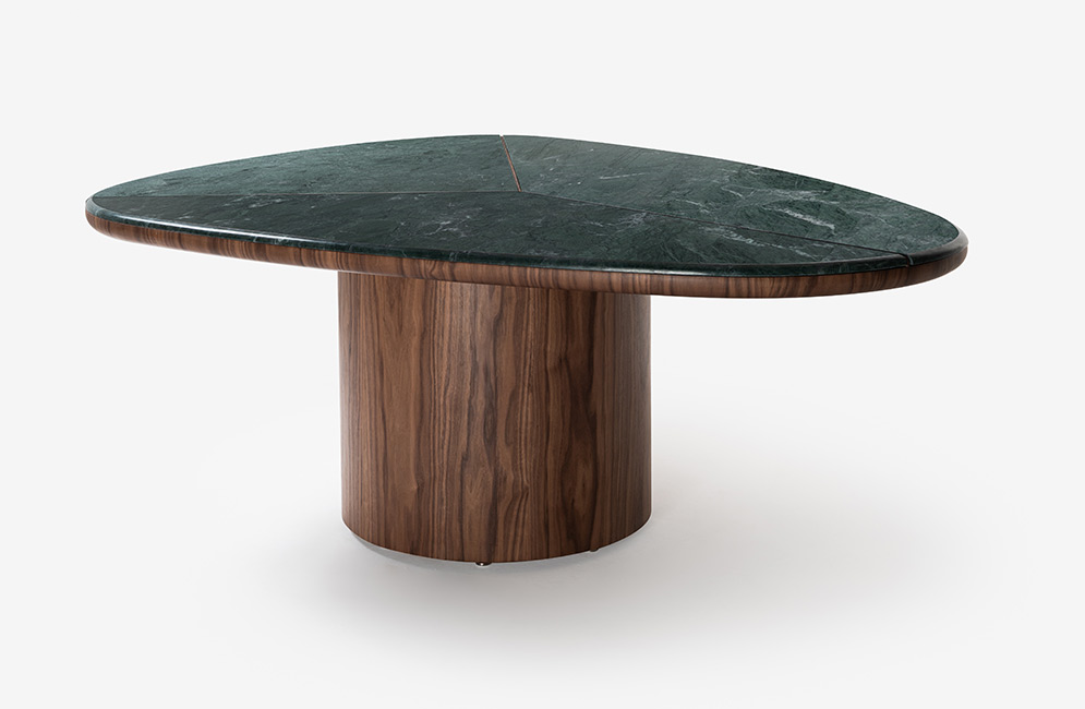 A mesa de jantar Bruma parte de um tampo tripartido, com geometria