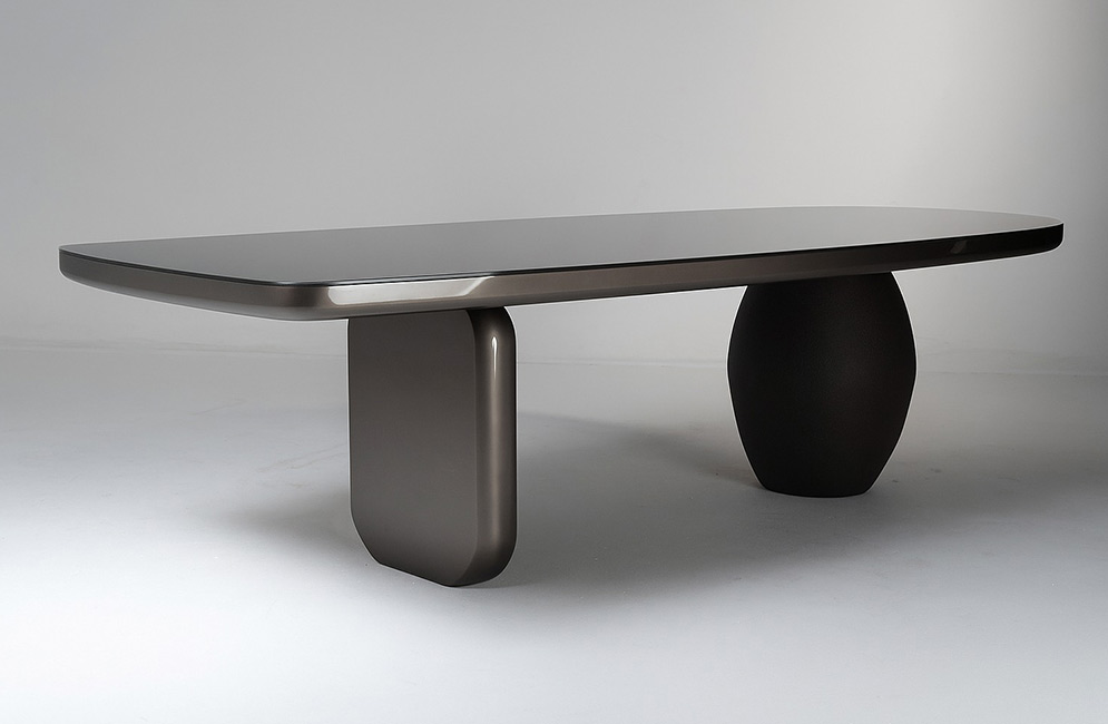 tampo de bordas arredondadas repousa sobre duas bases de materialidades distintas,