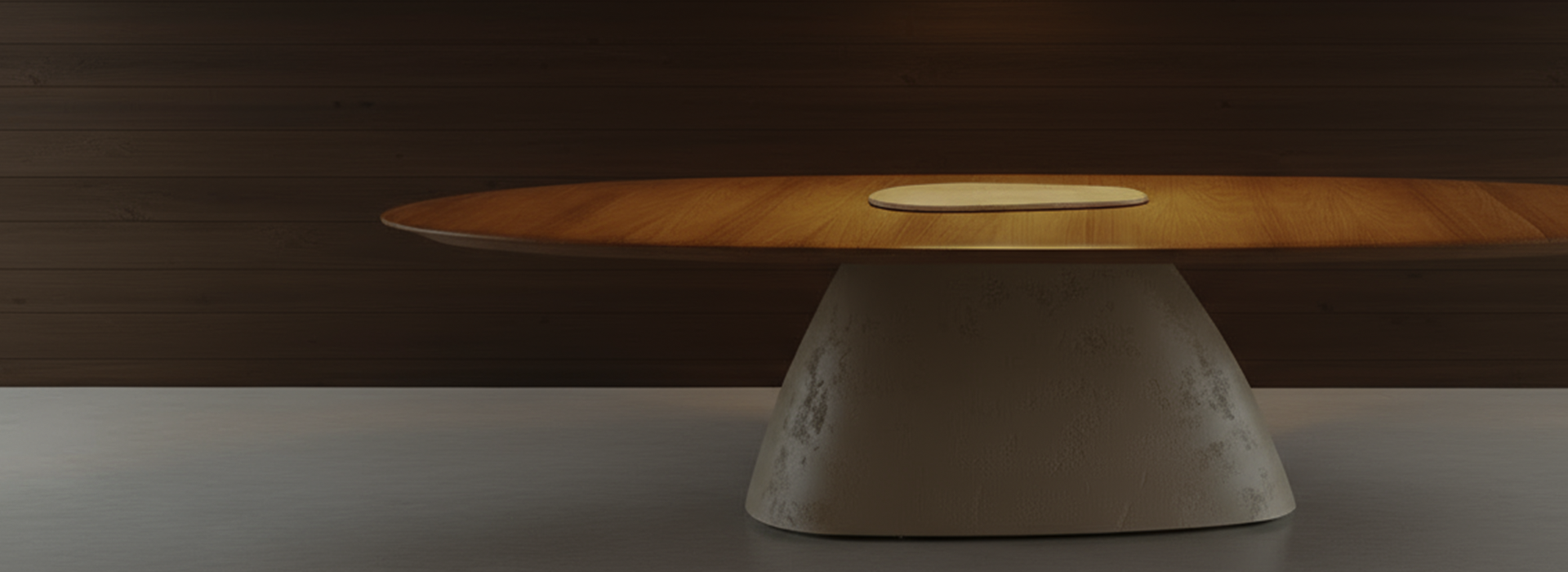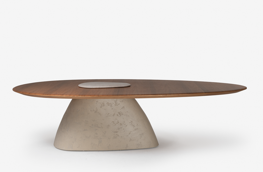 Inspirada nas paisagens geológicas das ilhas açorianas, a Mesa de Jantar Açores combina formas orgânicas com materiais de presença tátil. A base escultórica, de superfície mineral e contornos suaves, sustenta um tampo ovalado de madeira que parece flutuar no espaço. No centro, um detalhe em mármore atua como ponto de tensão e contraste, evocando a ideia de um núcleo rochoso, revelado em meio à superfície contínua.